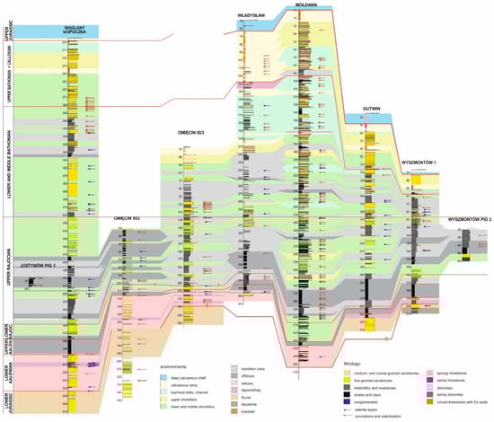 The archived and published results of the microfossil analyses of Kopik and the determinations of the ammonites by Deczkowski [,] for the analyzed boreholes were used. In addition, information on the Middle Jurassic stratigraphy provided in the papers by Różycki [], Cieśla [], Dayczak-Calikowska and Kopik [], and Dayczak-Calikowska [] was also used for proper correlation of boreholes. Additionally, a regional correlation with the complex of Middle Jurassic rocks of the adjacent Radom-Lublin region [,] was adopted. Based on the interpretation of sedimentary environments and all collected litho- and biostratigraphic data, a correlation cross-section was constructed across the boreholes analyzed in this study.