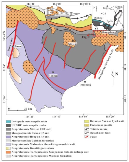 Geological map of the western Dabie orogen (modified after [36,37]).