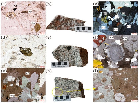 Representative field photographs and photomicrographs (single and crossed polars) of the Shangcheng pluton. (a,d) are samples of the SGD unit and SGW unit viewed under a single polar microscope. They include apatite, hornblende, biotite, magnetite, and other mineral particles; (b,e,h) are specimen photographs of the SGD unit, SGW unit, and LFW unit, respectively. A xenolith with a diameter of about 1 cm can be seen in the SGW unit; (c) shows the main rock-forming minerals, which are potassium feldspar, plagioclase, and quartz under crossed polar; (f) is a sample from the SGW unit, showing the ring structure of plagioclase; (g) is from the LFW unit and shows rock-forming minerals, such as quartz and potassium feldspar; (i) is a microscopic photo of giant potassium feldspar particles, which are wrapped in biotite, plagioclase, and quatrtz. Kfs—potassium feldspar; Pl—plagioclase; Qtz—quartz; Am—amphibole; Bt—biotite; Mag-magnetite; Ap—apatite.