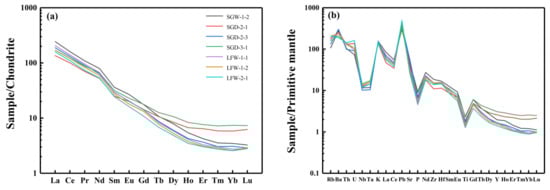 Chondrite-normalized REE patterns (a) and primitive mantle-normalized trace element spider diagram (b). Chondrite and mantle-normalized values were taken from [44,45].
