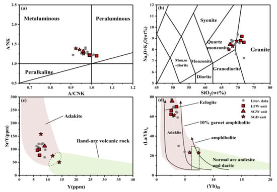 (a) A/CNK vs. ANK, (b) SiO2 vs. Na2O + K2O [46,47], (c) Y vs. Sr/Y [18], (d) (Yb)n vs. (La/Yb)n [48]; the curves in Figure 5d indicate the degree of melting.