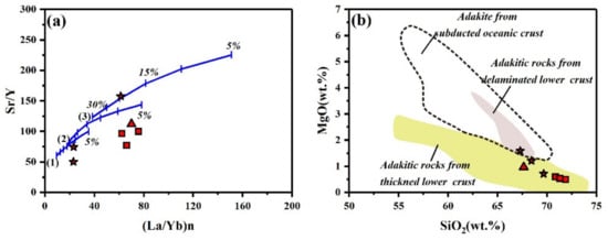 The Sr/Y-(La/Yb)n (Figure 6a) and MgO-SiO2 diagrams (Figure 6b) indicate that the investigated rocks used in this study may have originated from both thickened and delaminated lower crust through low-degree partial melting. All samples in this study are basically consistent with the compositional definition of adakite [18], with SiO2 ≥ 56 (wt.%), Al2O3 ≥ 15 (wt.%), MgO ≤ 3 (wt.%), Sr > 400 ppm, Sr/Y > 20, and no obvious Eu anomalies. Previous studies [38,39,40,41] have reached a consistent conclusion on the genesis of the Shangcheng pluton, which is that it was derived from the partial melting of mafic rocks in the lower crust. The Shangcheng pluton can be considered adakitic instead of adakite rocks, based on the genetic differences between them.
