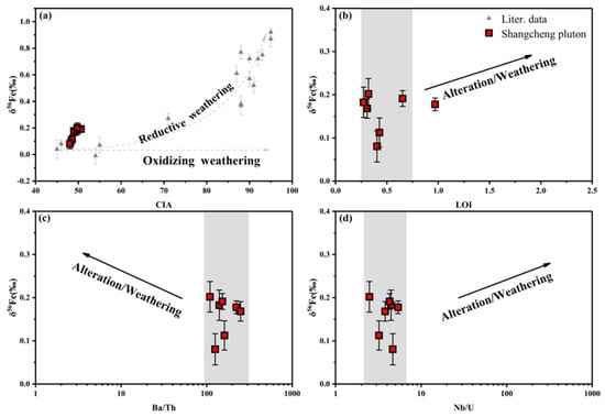(a) CIA vs. δ56Fe, (b) LOI vs. δ56Fe, (c) Ba/Th vs. δ56Fe, (d) Nb/U vs. δ56Fe; data were taken from [17].