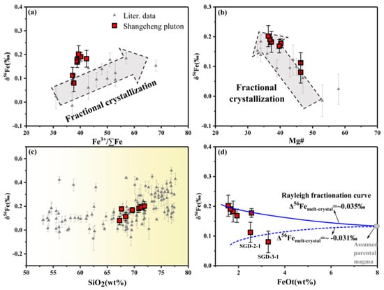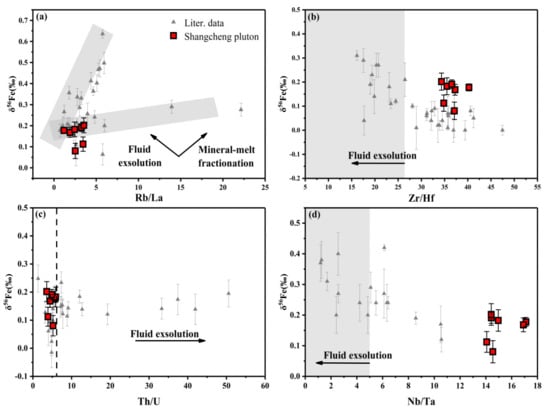 A correlation was not observed between δ56Fe and the four indices in this study (Figure 8a–d). On the Th/U vs. δ56Fe diagram (Figure 8c), the Th/U of the samples remains within the average Th/U value of the lower crust (~5.9 [14]) nearby. In addition, Du et al. [13] proposed that the control of iron isotope fractionation by fluid exudation is weak (<0.07‰). Therefore, fluid exsolution may not be the mechanism controlling the iron isotopic composition of the Shangcheng pluton.