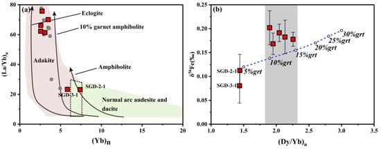 He et al. [14] reported the iron isotopic compositions of non-adakitic rock, low-Mg adakitic rock, and high-Mg Adak from the east Dabie orogen in Costa Rica/Panama, Central America and simulated the variation range of δ56Fe melt-residual during the partial melting of low-Mg adakite. The (Dy/Yb)n vs. δ56Fe diagram (Figure 9b) shows most samples plotted on the gray area, which may indicate the partial melting of eclogite containing 10~15% garnet, as the (Dy/Yb)n of melt = 1.9~2.3, δ56Fe melt-residual = 0.067~0.089‰, and δ56Fe melt = 0.138~0.155‰, according to previous simulation results [14]. This is similar to what can be observed on the (Yb)n vs. (La/Yb)n diagram, which displays an origin from melted amphibolite containing 10% garnet (Figure 9a or Figure 5d). It is notable that SGD-2-1 and SGD-3-1 may stem from the partial melting of eclogite containing 5% garnet or amphibolite, as shown in the (Dy/Yb)n vs. δ56Fe (Figure 9b) and (Yb)n vs. (La/Yb)n diagrams (Figure 9a or Figure 5d). The differences between the two samples from SGD and the other five samples suggest that the mineralogy of source rocks has had an effect on the fractionation of iron isotopes in the Shangcheng pluton.