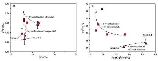 Considering the DNb/ DTa = ~1 in magnetite (DNb = 2.2, DTa = ~2.5; [66]), the fractional crystallization of magnetite may not lead to the variation of Nb/Ta (Figure 11a), but the concentration of Fe3+ or Fe2O3T in the residual melt decreases as fractional crystallization proceeds, resulting in enrichment with heavy iron isotopes (Figure 11b). Thus, the fractional trend of iron isotopes in SGD-2-1 and SGD-3-1 may demonstrate the fractional crystallization of magnetite.