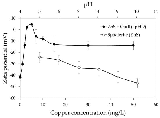 It can also be observed in Figure 1 the effect of Cu(II) concentration on the zeta potential of sphalerite at pH 9. Zeta potential increases as the Cu(II) concentration is varied from 0 to 5 mg/L. This behavior is due to the adsorption of copper hydroxide species onto the sphalerite surface and the exchange of Zn2+ of the crystal lattice by Cu2+. Then, cupric ions react with the nearby sulfides oxidizing them, leading to the formation of a new surface consisting of cuprous sulfide (Cu2S) and polysulfides (e.g., Sn2−, or cuprous disulfide (Cu2S2)), allowing the formation of copper xanthate and a greater zeta potential. This replacement mechanism also gives rise to the precipitation of Zn2+ from the sphalerite lattice as zinc hydroxide, which slowly dissolves and disperses exposing the hydrophobic surface previously formed [,].