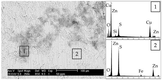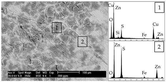 The formation of copper xanthate on the surface of sphalerite enhances its hydrophobicity, but this mechanism only occurs until 5 mg/L Cu(II). In Figure 2 can be seen the copper hydroxide adsorption/precipitation on the sphalerite surface when the mineral is conditioned at pH 9 and 50 mg/L Cu(II). The copper hydroxide does not cover the entire surface, but it begins to accumulate. The patches labeled as “1” corresponds to copper hydroxide and the zones labeled as “2” are uncovered sphalerite where no copper content was detected.