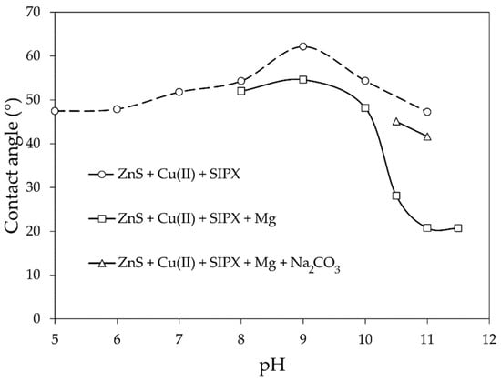 Figure 4 shows the effect of pH on the contact angle of Cu-activated sphalerite conditioned with SIPX (dashed line), Cu-activated sphalerite conditioned with SIPX in presence of magnesium, and Cu-activated sphalerite conditioned with SIPX in presence of magnesium and sodium carbonate.