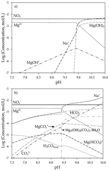 Species distribution diagrams of the (a) Mg-H2O and (b) Mg-CO3-H2O systems for 50 mg/L of Mg at 25 °C. The latter diagram stands for the cumulative addition of 2 g/L of Na2CO3 to 1 L of solution. Hydromagnesite starts to precipitate when 0.05 g/L of soda ash has been added.