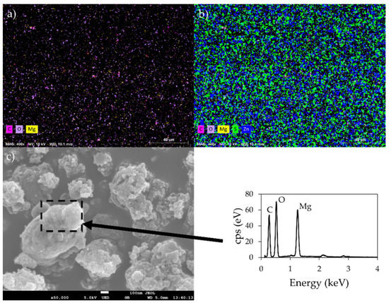 The elemental X-ray maps in Figure 7a,b clearly shows that the presence of sodium carbonate avoids the precipitation of magnesium hydroxide on the surface of Cu-activated sphalerite conditioned with SIPX. The elemental composition of the surface corresponds to that of sphalerite although it was conditioned in the presence of 50 mg/L of magnesium. Magnesium hydroxide precipitation/adsorption onto the mineral surface was not detected. These findings support the results of the contact angle experiments and thermodynamic simulation. The addition of sodium carbonate as alkalinizing agent enhances the hydrophobicity of sphalerite in presence of magnesium by preventing or dissolving the precipitated magnesium hydroxide. In the high-resolution SEM micrograph of Figure 7c can be seen the morphology of the dispersed precipitated magnesium compound, which avoids the detrimental effect on the hydrophobicity of sphalerite. According to a EDX microprobe analysis, the magnesium species corresponds to hydromagnesite (Mg5(OH)2(CO3)4∙4H2O) as indicated by the thermodynamic simulation presented in Figure 5b. The microprobe analysis was carried out in the area indicated in the dotted box of Figure 7c; magnesium, oxygen, and carbon were detected.