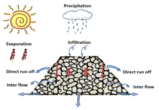 A coal stockpile consists of a heterogeneous distribution of porous coal particles, water, and gaseous types such as air and water vapour in interparticle channels and the microstructures of particles [18]. Considering only extraneous water addition, such as rain, for this study, there are four mechanisms of water movement in coal stockpiles. When the rain falls on a stockpile, it either runs off the surface or infiltrates. The infiltrated water can evaporate, drain, or stay within the stockpile [14]. Figure 1 is a schematic illustration of these mechanisms.