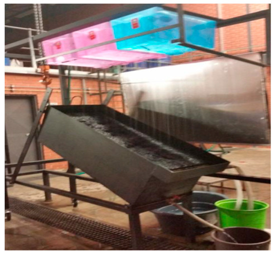 Experiments were carried out to investigate the water runoff and infiltration ratios as a result of stockpile configuration, coal particle size, and rainfall intensity. Experiments were performed on a rig consisting of a variable-angle rectangular container with an overhead rain system, shown in Figure 2. The dimensions of the coal container were 1.24 m × 0.50 m × 0.55 m, and could be set at angles of 0°, 20°, 30°, and 38° to the horizontal. Rainfall was simulated with the use of plastic containers over the setup. Each container had several 0.1 mm holes at the bottom, and was equipped with a float-ball valve to ensure a constant water level in the water tank and rainfall uniformity. Runoff water accumulated in the gutter and was removed through an outlet. The infiltrated water was removed by an outlet value at the bottom of the container, and the runoff water was collected in an overflow weir. To prevent the loss of coal particles through the bottom outlet, a metal mesh layer was installed just before this valve. The volumes of the infiltrated and runoff water collected over a certain time were noted.
