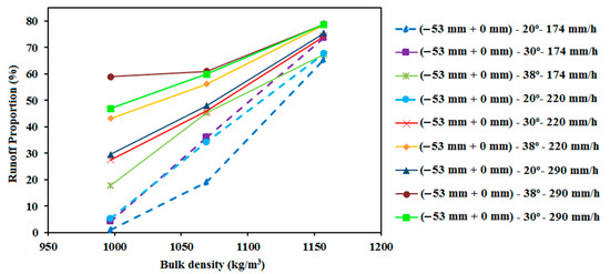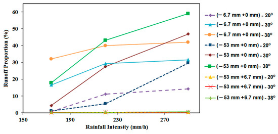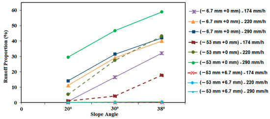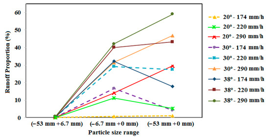 Figure 4 shows that the measured runoff proportion (as a fraction of the total water addition) is highly dependent on rainfall intensity in general, with an increase in rainfall intensity leading to a greater runoff proportion. Similar results were found in other studies [13,20,21,22]. In the bed of mixed particles with a size range of −53 to 0 mm, the increase in runoff rate was much more pronounced than that in other particle size ranges. The −53 to 6.7 mm particles caused no runoff, since the bed was sufficiently porous due to the lack of −6.7 mm material to cause all water to infiltrate. Increasing the rainfall rate from 220 to 290 mm/h did not significantly influence runoff proportion for the fine −6.7 to 0 mm particles.
