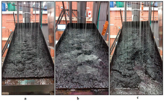 According to the literature, the proportion of rainfall that infiltrates a stockpile surface is a function of both rainfall intensity and duration, and the coal bed’s water infiltration capacity, which is determined by the bed’s texture, structure, and initial moisture content [25,26]. Once saturation is achieved, any increase in rainfall intensity only leads to an increase in runoff, provided that the sample remains undisturbed. According to Figure 9, the infiltration capacity for fine and mixed beds decreased as the slope increased in the laboratory experiments. For the coarse bed (−53 to 6.7 mm), the infiltration rate was not influenced by the slope angle. It would be expected that an increase in rainfall intensity leads to a slight increase of the infiltration rate, but this was not seen for uncompacted coal beds (997 kg/m3). This can be attributed to surface disturbances at high rainfall intensities and slop angles. It is apparent that the relationship between rainfall intensity and infiltration rate is complex and irregular. In coarse beds, high rainfall intensity causes an increase in infiltration rate. In this case, no surface disturbance was observed. For the mixed size bed (−53 to 0 mm) with a high slope angle and high rainfall intensity, infiltration rate decreased because of channelling. In the fine bed (−6.7 to 0 mm) with increasing rainfall intensity, infiltration rate increased because of ponding and creation of holes in the bed surface (Figure 10).