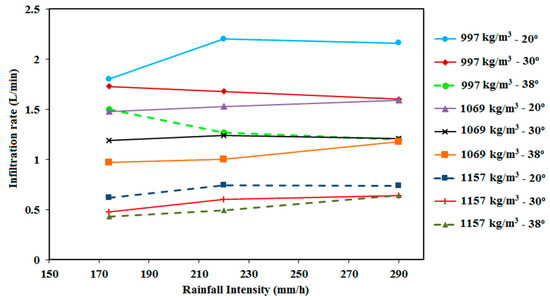 Infiltration rate versus rainfall intensity ( = 997 kg/m3).
