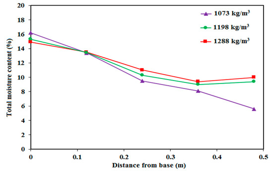 Changes in the total moisture content with bed height in the drainage experiments are presented in Figure 11. There was a clear difference between the total moisture content at the top and at the bottom of the noncompacted coal bed (ρ = 1073 kg/m3), but less so for the compacted coal beds (ρ = 1198 kg/m3 and ρ = 1288 kg/m3). This indicated that the compaction of the samples largely prevented the percolation and movement of water because the bottom layer of a coal stockpile can be more compacted due to the weight of the coal above it. So, the bottom layer of the coal stockpile would be wetter than the above layers.