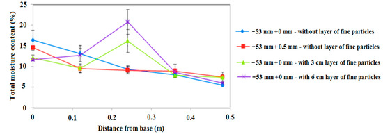 The two drainage columns were also used to study the effect of particle size distribution on drainage characteristics. For the short 0.5 m drainage column, results are summarised in Table 7. The presence of fine particles (−0.5 mm) inhibited the drainage of moisture from the coal bed, and the absence of fine particles translated into a decrease in the amount of retained water. This is further supported by the inclusion of a fine layer to the middle of the drainage column resulting in an increase in the amount of retained moisture (Figure 13). The thickness of the fine layer had a significant effect on the moisture holdup in that layer, but did not seem to affect the moisture in the rest of the bed. For the 2 m column, two different coal types with several different size ranges were used. A coal bed containing fewer fine particles retained less of the added water (Table 8), similar to the 0.5 m drainage column.