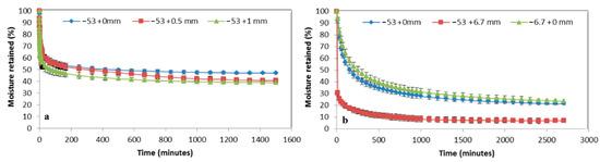Figure 14 displays the drainage profiles for the two coals. For Coal A (Figure 14a), the exclusion of the −0.5 mm particles had a much larger effect than that of the exclusion of −1 mm particles on the final retained water mass. This indicates that drainage-related problems depend on the −0.5 mm fraction. This was similar for Coal B (Figure 14b). The coarse coal sample (−53 to 6.7 mm) drained almost instantaneously and retained very little of the added water. In contrast, the mixed sample (−53 to 0 mm) and the fine sample (−6.7 to 0 mm) retained approximately 20% of the added water. The mixed and fine samples also drained at a much slower rate than the coarse sample did due to the difference in void spaces within the coal bed. As mentioned in the literature, a decrease in particle size translates into fewer interstitial voids that inhibit the movement of moisture [8].