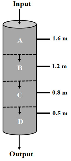 Since there was no uniform structure within the drainage column due to variability and heterodisperse particles, the representative sample in the 2 m high drainage column was difficult. It was thus necessary to validate the moisture profiles obtained by means of mass balances. The drainage pipe was divided into four sections, and each sample was assumed to be representative of its section as a whole. The initial moisture content of the sections and the decrease in total coal mass over time as a result of sampling were taken into account. A mass balance over each section is calculated by Equations (1) and (2):
