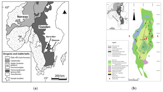 - Sjöqvist, A.S.L. Agpaitic Rocks of the Norra Kärr Alkaline Complex: Chemistry, Origin, and Age of Eudialyte-Hosted Zirconium and Rare-Earth Element Ore. Licentiate Thesis, University of Gothenburg, Gothenburg, Sweden, 2015. [Google Scholar]
