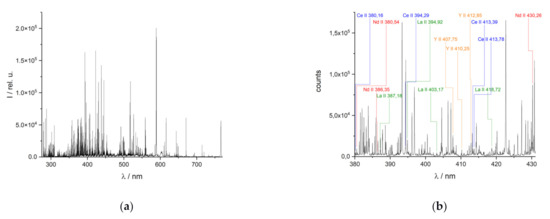 LIB spectra of REE-bearing minerals are highly complex due to the line-rich REE [12,13]. The NIST LIBS database displays, e.g., 7723 lines for cerium. Furthermore, REE often occur associated with other REE. In addition, strong emission lines of other elements of the surrounding matrix contribute to the complexity of the spectra. A typical LIB spectrum of a REE-bearing mineral and an enlarged partial spectrum are displayed in Figure 2.