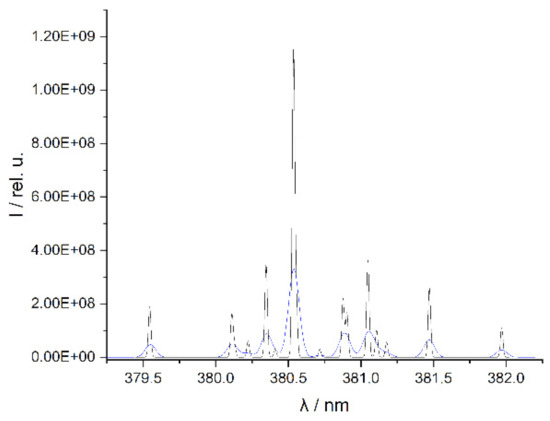 Spectra of Nd (element peak at 380.5 nm) simulated on the basis of the NIST database [39] with a spectral resolution of 100 pm (blue line) and 25 pm (black line).