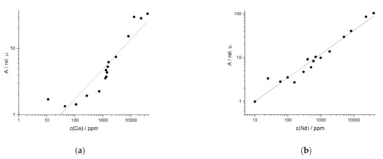 For synthetic REE samples of rocks, the UVR functions of the Ce line at 413.76 nm and the Nd line at 386.34 nm are shown in Figure 4 as examples. Both elements show the best regression results at these emission lines in terms of linearity, which is R² = 0.91 for Ce and R² = 0.98 for Nd. The other studied REE, La and Y, also have good coefficients of determination at the selected wavelengths: R² (La at 379.08 nm) = 0.99 and R² (Y at 412.82 nm) = 0.97.