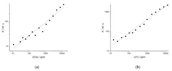 The results of the UVR obtained for the synthetic samples in soils were similar to the synthetic minerals although the emission lines varied. Examples are the results for the REE Ce and Y in soils (Figure 5). For Ce the emission line at 413.76 nm, and for Y the line at 488.36 nm were used, respectively. Both have high coefficients of determination (R² (Ce) = 0.99, R² (Y) = 0.98). Coefficients of R² > 0.96 were also obtained for the UVR of the elements La (404.29 nm) and Nd (386.34 nm). The other reported lines of the REE in rock and soil also yield good results, but they show reduced linearity as indicated by smaller R² (R² = 0.90–0.99, Table 2). The detection limits of the REE in rock and soil are similar for most elements. Their average LOD is 200 ppm (except for La in rock, which exhibited an unusually high LOD as a result of the large spread of the data points, very likely due to matrix effects) with a standard deviation of 110 ppm. Nevertheless, the values of the LOD vary between elements and even between the matrices for one element, sometimes significantly.