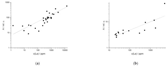 Only spectral lines which occur in the entire examined concentration range were used. Since unsuitable lines also occur for each element (Table 1), different emission lines were used for the analyses in the different matrices. In the investigated field samples, the REE content varies over several orders of magnitude (from 1 ppm up to 3%). Therefore, the presentation of the regression lines is best done by a double logarithmic plot to cover the whole concentration range. All lines investigated are summarized in Table 2 with the corresponding coefficients of determination and LOD.