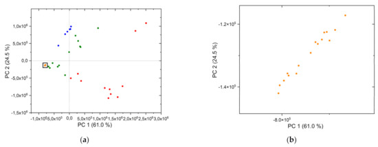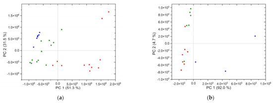 (a) PCA of reference rocks (VIS, raw), (b) PCA of reference soils (VIS, raw): blue—Fen complex, green—Olserum, red—Norra Kärr.