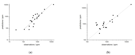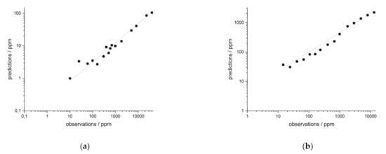 The application of iPLS regression to the heterogeneous field samples yields significantly better regression results than the UVR in all cases investigated. For samples in rock, R² > 0.91 can be obtained (Table 5). For lanthanum (Figure 10a), in contrast to the UVR (R² = 0.82), a coefficient of determination of R² = 0.92 can be achieved by iPLS regression. For neodymium, a R² of 0.98 is found by using the multivariate regression method (Figure 10b), which is also significantly better than for UVR (R² (UVR) = 0.56). Somewhat less pronounced, but equally good, are the improvements in the regressions of cerium and yttrium in rock.