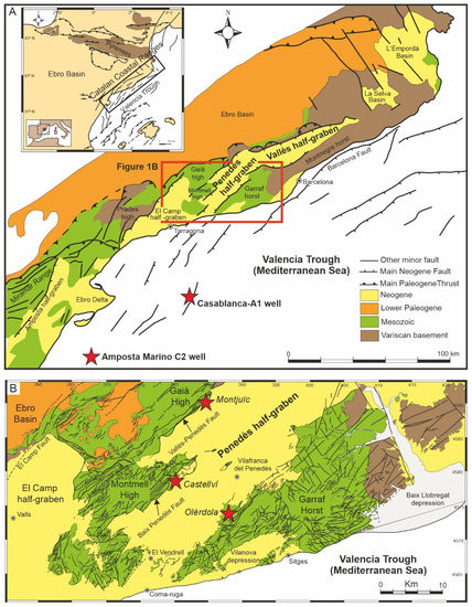 (A) Simplified geological map of the Catalan Coastal Ranges and location of the Casablanca-1A and Amposta Marino C2 wells in the València Trough (red stars). The red box indicates the location of Figure 1B. (B) Geological map of the Penedès half-graben showing location of the Castellví, Olèrdola and Montjuïc outcrops (red stars). Redrawn from [3].