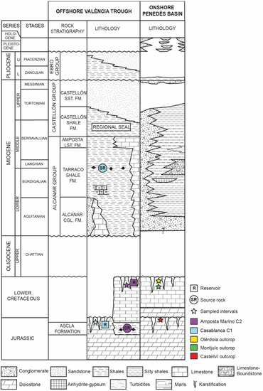 A summary of the stratigraphy of the València Trough was presented by [15] (Figure 2). Rift-related sedimentation began with the deposition of Chattian to Aquitanian red beds, conglomerates and dolostones (Basal Tertiary Group), which are unconformably overlain by Burdigalian–Langhian dark to black argillaceous limestones with variable organic-carbon content (Casablanca Group). These sediments are the main source of rock of the Casablanca oil field in the València Trough [30,31]. Source rocks of the Casablanca Group are overlain by Serravallian turbidites of the Sant Carlos Group and/or limestones and marls of the Castellón Group, which in turn are overlain by Tortonian to Messinian shales. These shales acted as a regional seal. Younger sediments consist of Plio-Quaternary shelf sandstones and conglomerates of the Ebro Group [32].