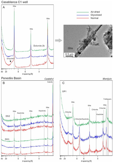 Air-dried, ETG and heated (550 °C) XRD diagrams of the non-carbonate fraction of Dolomite 2b fills in the Casablanca-1A well, DS2 and DS3 dolomite fills in Castellví outcrop and orange pisoids in the Montjuïc outcrop. For Dolomite 2a, XRD spectra are redrawn from [15].