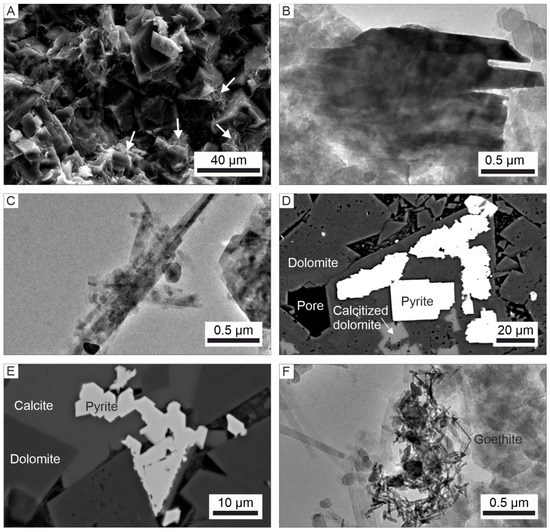 SEM and TEM images of the non-carbonate fraction of Dolomite 2a and 2b in the Casablanca-1A well. (A) SEM microphotograph of Dolomite 2b coated by flaky particles of illite (white arrows). (B) TEM microphotograph of an irregular flaky particle of illite. (C) TEM microphotograph of lath-shaped crystals of illite in Dolomite 2B. (D) SEM microphotograph of pyrite placed within growth cavities of dolomite. (E) SEM microphotograph of pyrite disseminated between dolomite crystals. (F) TEM microphotograph of goethite crystals within reddish Dolomite 2b.