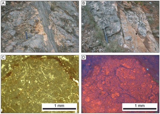 Lower Cretaceous limestones from the footwall of a normal fault are in contact with Neogene siliciclastic sediments of the hangingwall at the Montjuïc outcrop. The fault zone consists of a cataclasite (Figure 9A), which is surrounded by fractures filled with collapse-breccias with an orange fill made of pisoids (OP1) (Figure 9B). Breccia fragments are derived from adjacent host rocks and are supported by the orange fill, which displays red luminescence (Figure 9C,D). The non-carbonate fraction of OP1 consists of chlorite, kaolinite, illite and feldspars (Figure 4C).