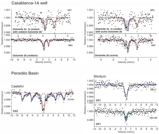 The Mössbauer spectra of carbonate host rocks and karst fills of the offshore Casablanca-1A well and onshore Penedès Basin are shown in Figure 10, and the results are listed in Table 3.