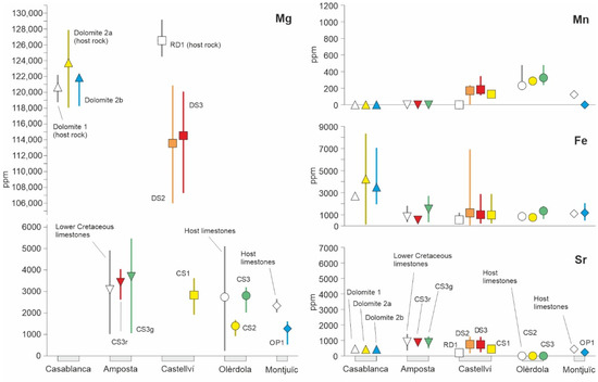 The Mg content of host limestones from the Olèrdola outcrop ranges between 231 and 5103 ppm, the Mn content is between 231 and 478 ppm, the Fe content is between 578 and 1253 ppm and the Sr content is below the detection limit. For CS2, the Mg content ranges from 1672 to 923 ppm, and the Mn and Fe contents range from 239 to 287 and from 530 to 916 ppm, respectively. The Sr content is below the detection limit. For CS3, the Mg, Mn and Fe contents range from 2018 to 3200 ppm, from 239 and 478 ppm and from 627 to 1784 ppm, respectively. The Sr content is below the detection limit.