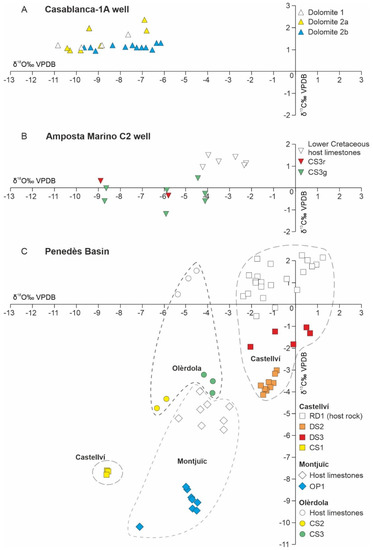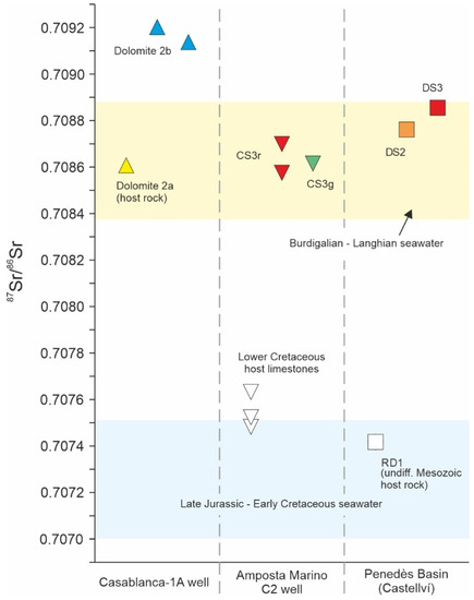 The isotopic and elemental composition of karst fills compared with that of their host carbonates reflect the input of external fluids and organic components as well as diagenetic processes. Their δ13C and 87Sr/ 86Sr isotope geochemistry are, in general, different from that of their adjacent Mesozoic host carbonates (Figure 10 and Figure 11). For example, karst fills from the Amposta Marino C2 well and Penedès Basin have depleted δ13C values with respect to their adjacent host rocks (Figure 12), probably indicating the input of soil-derived CO2 during the subaerial exposure of Mesozoic carbonates [61,62]. This interpretation agrees with the study of [61], which concluded that paedogenic carbonates have δ13C values between −10 and +2‰ VPDB. Accordingly, the lighter δ13C of fills in the exposed outcrops of the Penedès Basin supports a meteoric scenario for their accumulation, whereas the values of fills in the offshore Amposta well are also within the range of paedogenic carbonates. Contrarily, the similar δ13C values of dolomite 1, 2a and 2b from the Casablanca oil well are interpreted by [15] as the result of a similar dolomitising fluid interacting with host rocks and karst fills. The 87Sr/ 86Sr ratios of all the karst fills show higher ratios than their adjacent host rocks and Late Jurassic–Early Cretaceous seawater, suggesting the influence of a more radiogenic source or Burdigalian–Langhian seawater, as indicated in Figure 13. Alternatively, the higher 87Sr/ 86Sr ratios of Dolomite 2a and 2b from the Casablanca-1A well with respect to those of Dolomite 1 could be the result of clay leaching during dolomitisation of these fills, according to [15]. The δ18O isotopic composition of most of the karst fills has similar values to that of their adjacent host rocks, indicating a local origin of the carbonate fraction. Contrarily, CS3r and CS3g in the Amposta oil well and CS1 in the Castellví outcrop have more depleted δ18O values than those of their host carbonates. This depletion is interpreted at the Amposta oil well as resulting from the recrystallisation of CS3r and CS3g fills from evolved meteoric waters [16], although an influence of hot fluids cannot be ruled out. Contrarily, [3] interpreted that CS1 of the Castellví outcrop precipitated from meteoric fluids, based on a large dataset of geochemical data of fracture-filling carbonates and karst fills sampled throughout the Penedès Basin. Regarding the elemental composition of karst fills, the higher Mn content of the fills from the onshore Penedès Basin with respect to those of the offshore Casablanca and Amposta oil wells could indicate a greater influence of meteoric fluids onshore [63]. Moreover, the decrease in Mg of the Castellví outcrop from RD1 to CS1 could indicate a progressive increase in meteoric fluids or a change in the host-carbonate feeding the karst system.