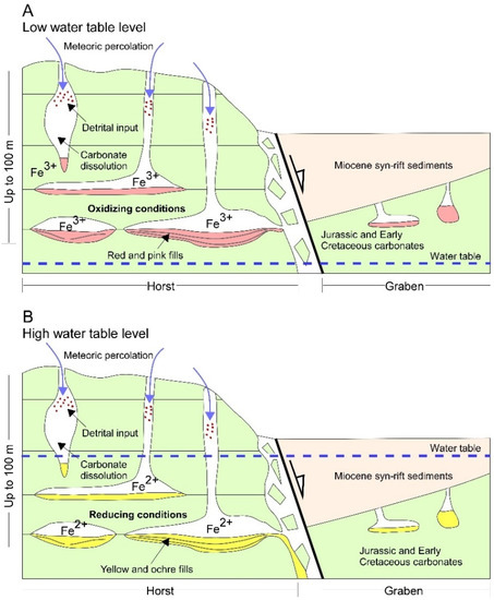 - The variation in colour of the karst fills is attributed to fluctuations in the water table, which control the Eh/pH conditions in the karst system. Thus, reddish colours are attributed to lower water table level and oxidising episodes, and orange and ochre ones to high water table level and more reducing episodes.