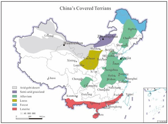 China’s covered terrains (modified after Wang et al. [2]) and location of the deposit fields.