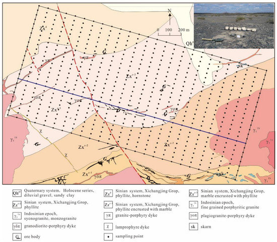 A total of 11 survey lines were laid out along the exploration lines of the Zhunsujihua copper-molybdenum mine, with a sampling point distance of 80 m (Figure 3). The sampling depth in the semi-grassland covered area is 5–30 cm. Fine-fraction soil samples (<76 μm) composed of 3 to 5 subsamples within 5 m around the sampling point were collected along the survey lines. Copper (Cu), molybdenum (Mo), and other elements were analyzed following the strict requirements and specifications listed by the IGGE. The quality control of samples was conducted, as described above in Section 2.2.1. Copper and molybdenum were analyzed by plasma mass spectrometry (ICP-MS), with a reporting rate of 100%. The detection limit of Cu was 1 ppm, and that of Mo was 0.2 ppm. The qualified rate of the standard reference materials, the blank samples, and the duplicate samples was 100%.