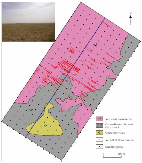 The semi-arid grassland coverage area is distributed in the middle eastern part of inner Mongolia, roughly 106°–120° east longitude and 40°–50° north latitude, north of the Yinshan Mountains and west of the Greater Hinggan Mountains, covering an area of about 323,900 km2 [17]. It is an important polymetallic metallogenic belt in inner Mongolia. The selected mining area is the Zhunsujihua copper-molybdenum deposit, northwest of Sonid Zuoqi, Xilin gol League, in the inner Mongolia Autonomous Region. It is located in the Late Paleozoic continental marginal accretion belt of the southeastern continental margin of the Siberian Plate. It belongs to a part of the Late Paleozoic-Mesozoic metallogenic belt of Erlian-Dongwuqi, Mongolia-Daxinganling Metallogenic Province, Paleo-Asian metallogenic domain [20]. The exposed strata around the study area are Carboniferous-Permian clastic rocks and Holocene residual slope deposits. The Carboniferous-Permian strata are mainly metamorphic feldspar quartz sandstone and silty slate. The Quaternary stratum is mainly clay, sand, and gravel, with aeolian sand in some parts. The exposed magmatic rocks in the study area are mainly Variscan granodiorite, closely related to Cu and Mo mineralization [20,21].