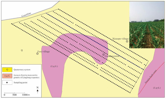 The alluvial soil covered terrain is distributed in China’s central and eastern plains, covering approximately 996,200 km2 [17]. Here, Jiaodong is chosen as the experimental area. Jiaodong is one of the only three gold mining provinces globally with proven gold resources of more than 5000 tons. Covering less than 0.2% of the country’s land area, more than 200 gold deposits have been discovered in Jiaodong, accounting for approximately one-third of China’s known gold resources [22,23]. There are fewer surface and shallow mines in this area with the continuous increase in geological exploration, and gold prospecting is becoming more difficult. Deep exploration of blindness and coverage areas has become the focus of prospecting in this area [24]. The area between the Sanshandao fault zone and the Jiaojia fault zone is covered by alluvial soil of the Quaternary system, and the farmland is widely spread. The traditional geochemical exploration methods are limited in the covered area. Jiaojia gold belt is mainly distributed along the Jiaojia fault zone, which is about 60 km long and up to 1000 m wide at the widest point. This metallogenic belt includes Jiaojia, Xincheng, Sizhuang, Zhuguolijia, Shaling, and Qianchen, with large to super-large gold deposits [25]. The Qujia concealed gold mining area was used as a test area to detect the exploration effect of the fine-grained soil prospecting method. The mining area is located in the middle section of the Jiaojia gold metallogenic belt. It is the deep extension of the Xincheng and Dongji gold deposits. The NNE-NEE-trending Jiaojia fault structure controls it, and there are a large number of secondary faults, joints, fissures, and mineralized alteration zones developed on both sides of the main fault. The alteration zone extends in a slow wavy shape both in plane and section, and the Quaternary is widely distributed on the surface of the area. Below the Quaternary are monzonitic granites of the Cuizhao unit of Linglong sequence in the early Yanshanian and the porphyritic granodiorite of the Guojialing sequence in the late Yanshanian [26].