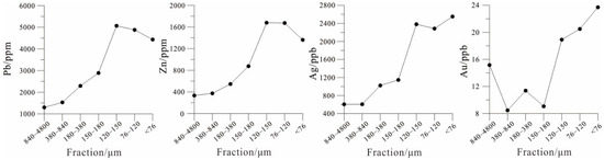 Pb, Zn, Ag, and Au line chart in different sized soil fractions in the Huaniushan test area.