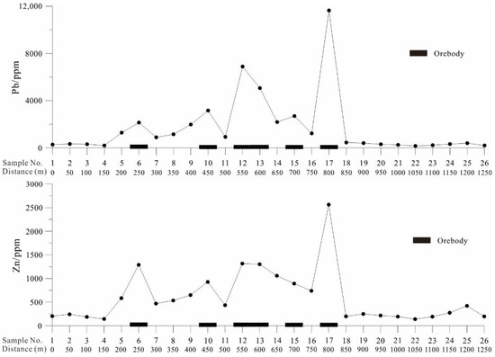 Pb and Zn line chart of fine-fraction soil samples (<76 μm) across the concealed ore body in the Huaniushan deposit.