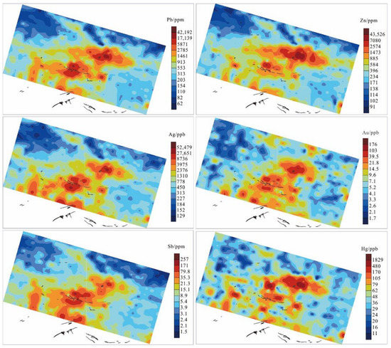 The areal measurement results of the fine-grained soil prospecting method of the Huaniushan lead-zinc mine are shown in Figure 7. The value corresponding to 85% quantile is classified as the outlier, and the anomalous area is shown as orange to deep red coloration on the geochemical map. The horizontal section of the ore body is superimposed on the contour map to show the geochemical distribution characteristics of the elements and the positional relationship between the element anomalies (orange to deep red in Figure 7) and the ore body. The results show that the geochemical maps of the main ore-forming elements (Pb and Zn) and indicator elements (Ag, Au, Sb, and Hg) are similar, and the multi-element anomalous combinations are mainly concentrated in the middle of the experimental area, spreading east-west, with a high concentration center. The anomaly is continuous and corresponds very well to the No. 2 ore body. At the same time, the anomaly is not closed in the experimental area and corresponds to the No. 3 ore body outside the experimental area. As such, the fine-grained soil prospecting method can effectively indicate deep concealed ore bodies and can be used as an effective method for finding deposits in the arid Gobi Desert area.