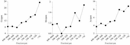 Line chart showing the concentrations of Cu, Mo, and As in different sized fractions of soil in the Zhunsujihua deposit.