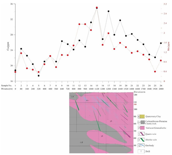 Cu and Mo line chart of fine-fraction soil samples (<76 μm) across the concealed ore body in the Zhunsujihua deposit.